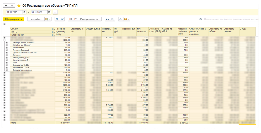 Реализация услуг формируется автоматически одним документом сразу по всем объектам. Система сама рассчитывает время работы каждой машины на конкретных объектах, специалисту остаётся только проверить отчёт без ручного ввода данных.
