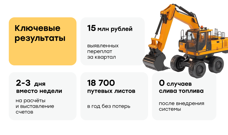 Система создала условия для принятия решений на основе точных данных, снизила финансовые риски и обеспечила контроль над ключевыми показателями работы автопарка.