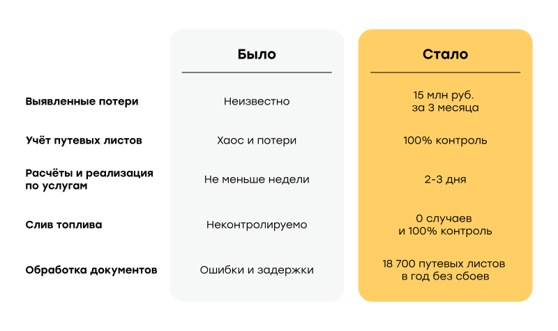 Дополнительным фактором стала перспектива перехода на электронные путевые листы. В компании понимали, что просто отказ от бумаги без перестройки процессов приведёт к ещё большему количеству ошибок. Для такого перехода сначала необходимо было выстроить прозрачный и управляемый учёт.