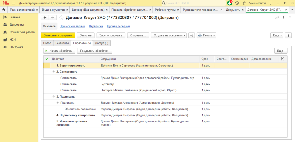 Ответ простой – с помощью автоподстановки ответственных в процессе согласования. Вам не нужно каждый раз подбирать сотрудников для согласования – 1С:Документооборот сам сформирует маршрут в зависимости от вида документа.