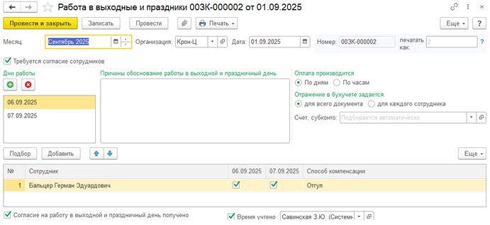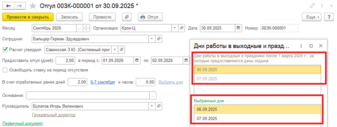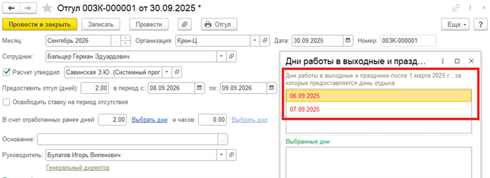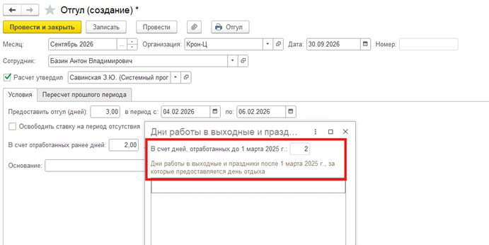 Если сотруднику предоставлен отгул после 01.03.2025, то по истечении года после регистрации отгула при попытке зарегистрировать отгул в счет отработанных дней программа будет выдавать ошибку.