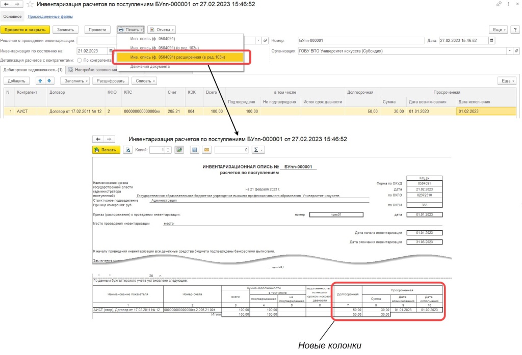 В печатных формах Инв. опись (ф. 0504091) расширенная (в ред.103н) (Инв. опись (ф. 0504089) расширенная (в ред.103н)) добавлены колонки для долгосрочной и просроченной задолженности, включая даты возникновения и исполнения задолженности.