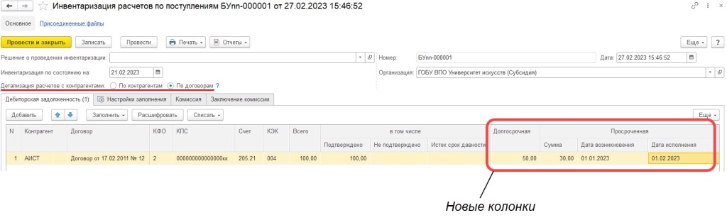 В документах Инвентаризация расчётов с контрагентами и Инвентаризация расчётов по поступлениям (с версии 2.0.89.65) предусмотрены колонки для указания долгосрочной и просроченной задолженности: