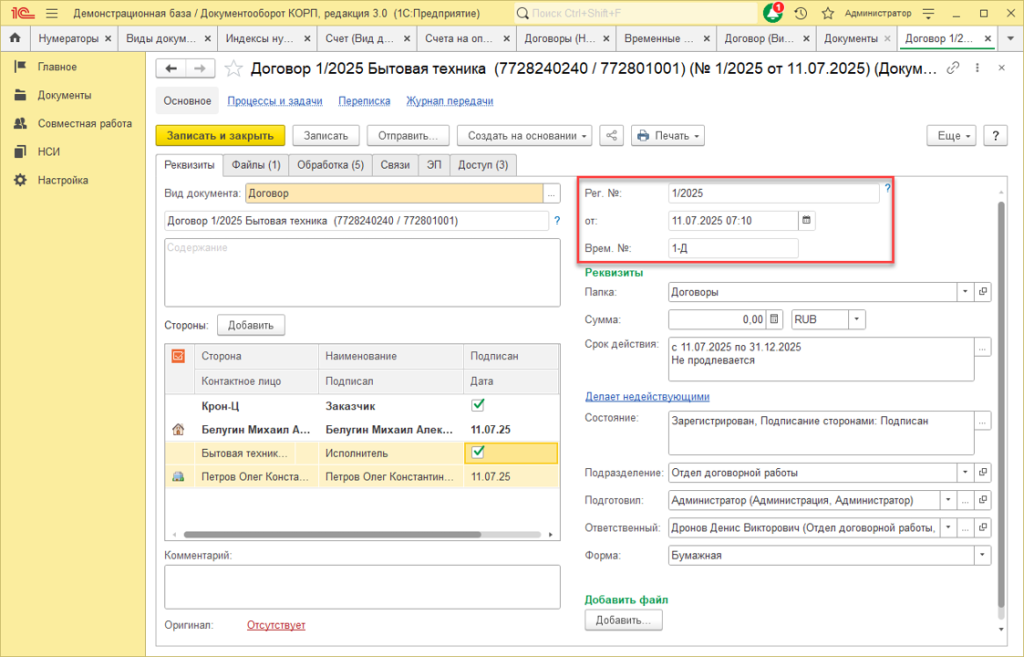 У документов есть не только регистрационный номер, который заполняется после регистрации, но и временный, который заполняется при создании – это помогает работать с документом и искать его ещё до их официальной регистрации.