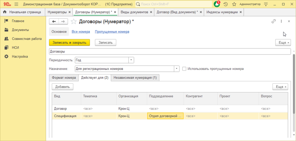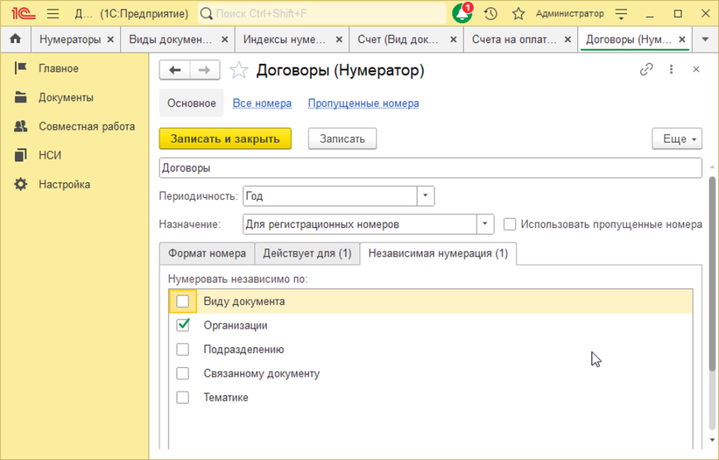 Независимая нумерация позволяет каждому документу иметь уникальный номер, который формируется независимо от других документов, настраивается по указанным в системе разрезам: