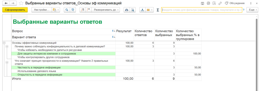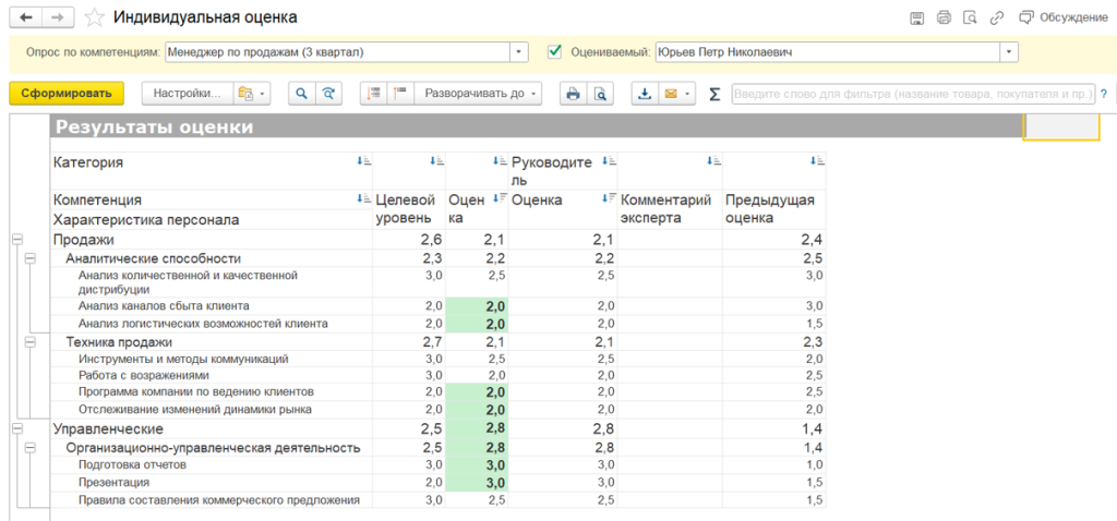 После проведения оценки 1С автоматически сформирует отчёт по соответствию компетенций. Вы можете создать отчёт не только по текущему состоянию, но и по сравнению с предыдущими оценками. Это помогает HR и руководителям видеть реальные зоны развития и готовность сотрудников к новым задачам.