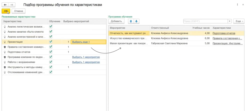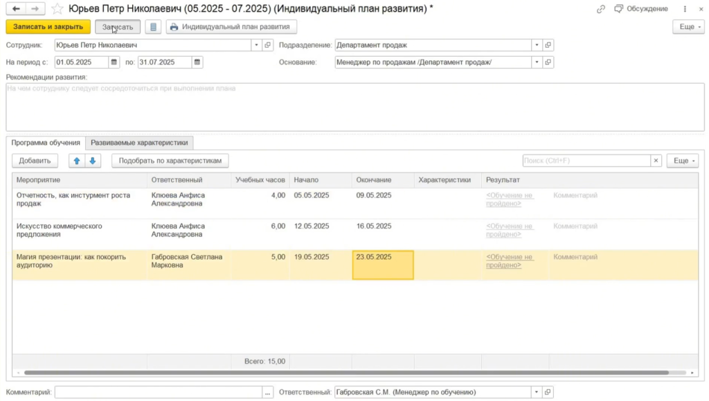 Таким образом на основании выявленных пробелов формируется программа обучения, включающая конкретные мероприятия. Все данные хранятся в одной системе, HR и руководитель видят общий план, контролируют прогресс и могут планировать ресурсы.