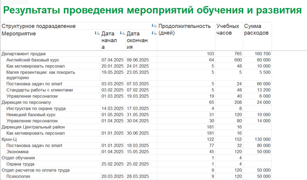 1С:ЗУП КОРП собирает все данные по обучению и развитию в удобные отчёты и дашборды, которые показывают выполнение плана, результативность и затраты.