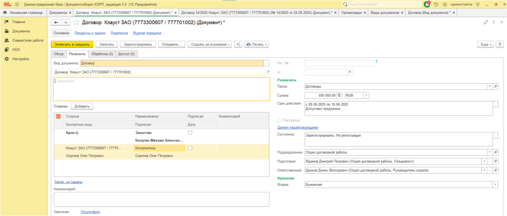Если вам не хватает набора типовых реквизитов, то система позволяет добавить новые реквизиты в карточку документа – например, количество дней отсрочки по оплате договора.
