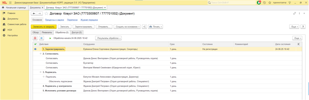 На вкладке обработка отображается результат настройки маршрута для документов данного вида.