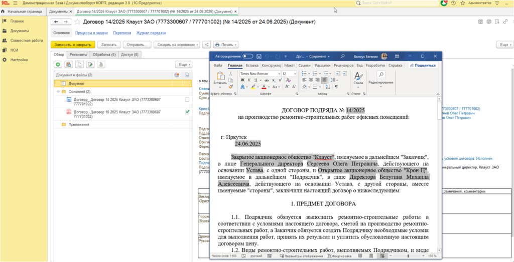 Вид документа в 1С:Документооборот – это ключевой элемент, который определяет, как документ будет обрабатываться. Его настраивают 1 раз, после чего при создании нового документа пользователю нужно только выбрать вид – всё остальное система подставит автоматически.