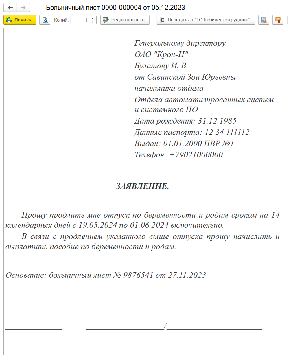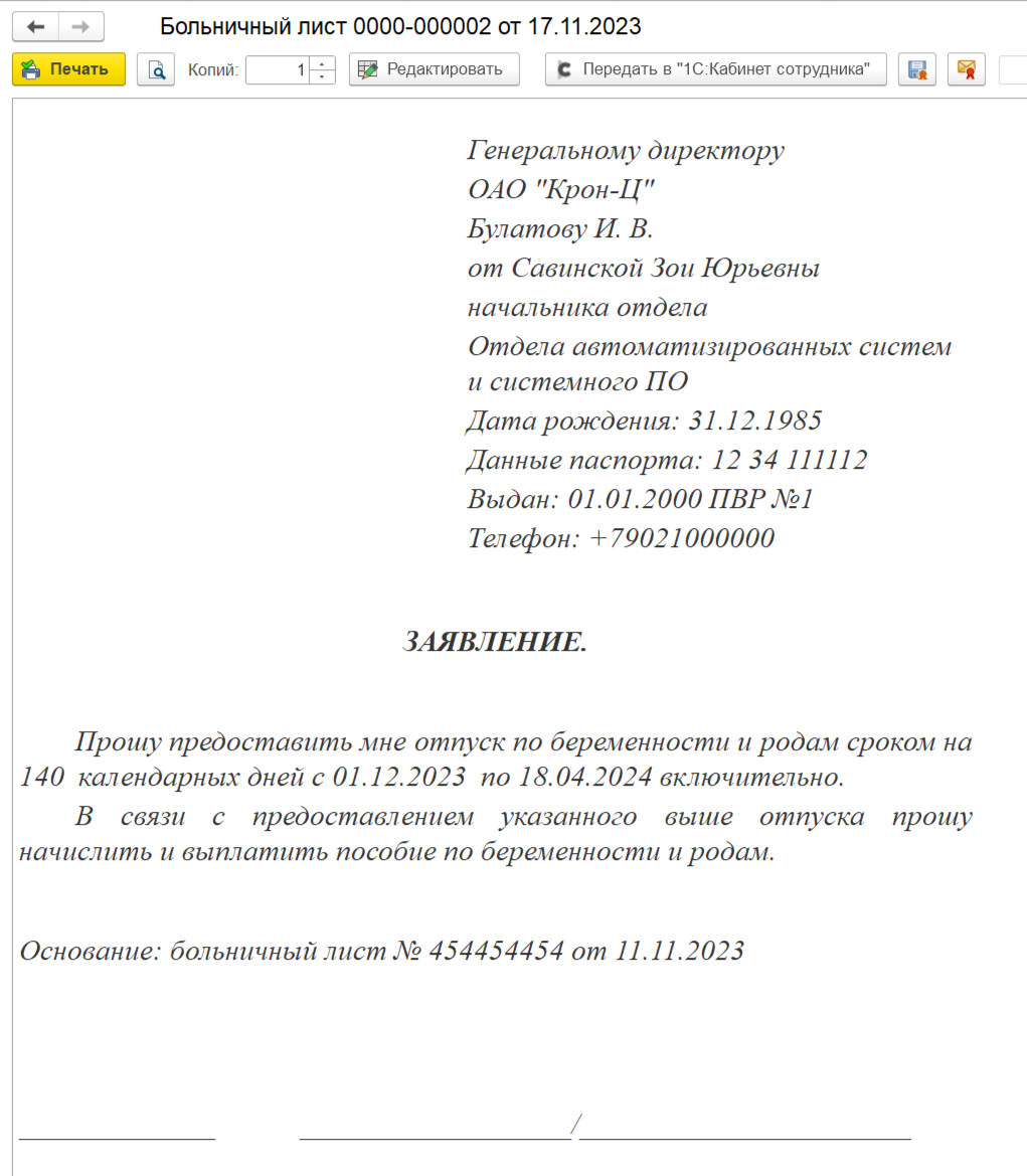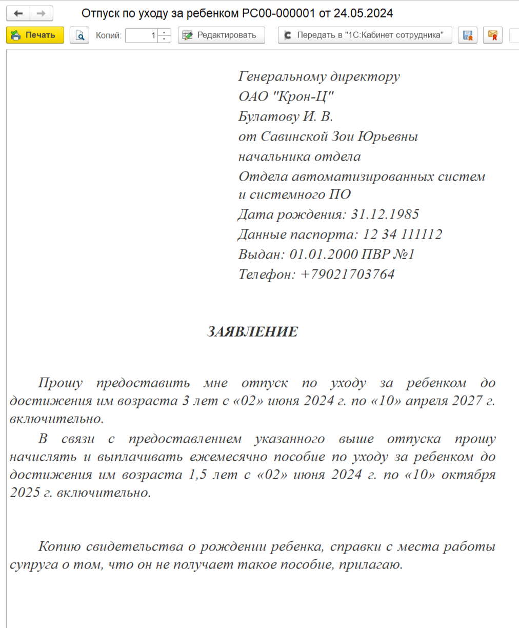 Заявление о замене части отпуска в случае, когда в документе «Отпуск» регистрируется только компенсация