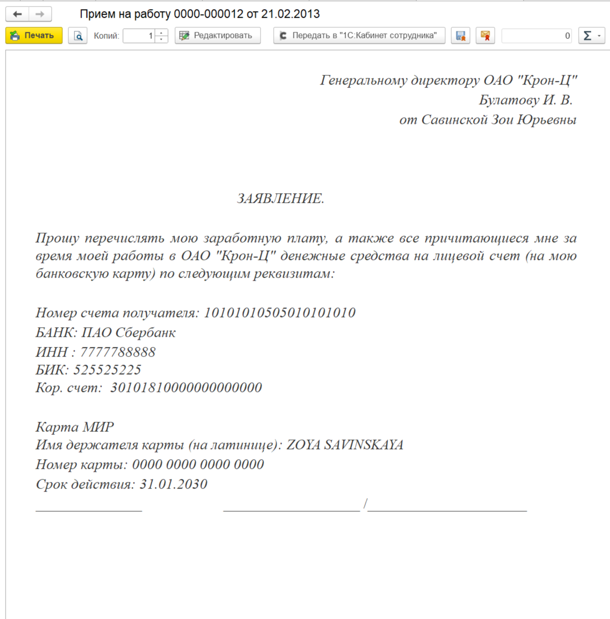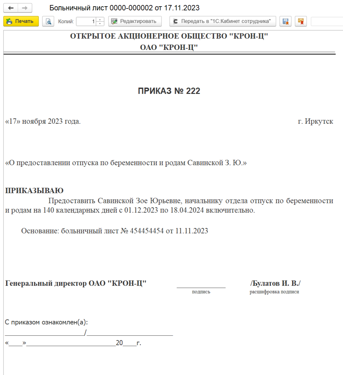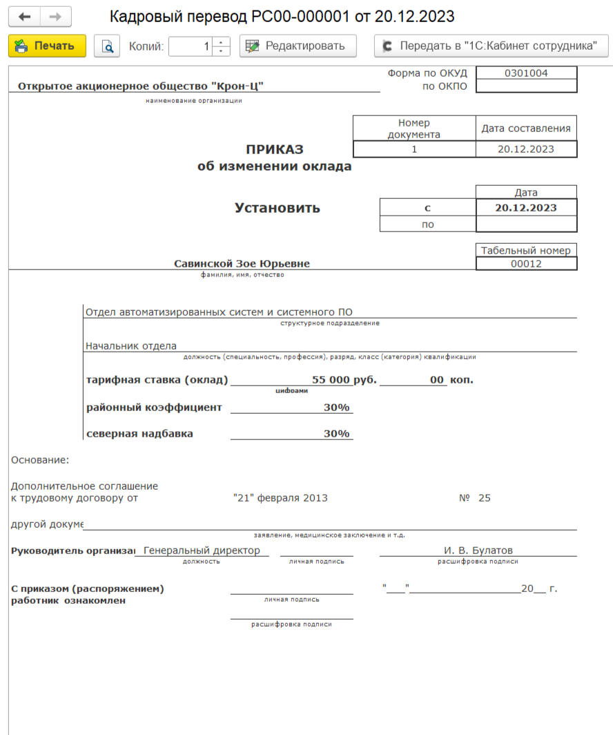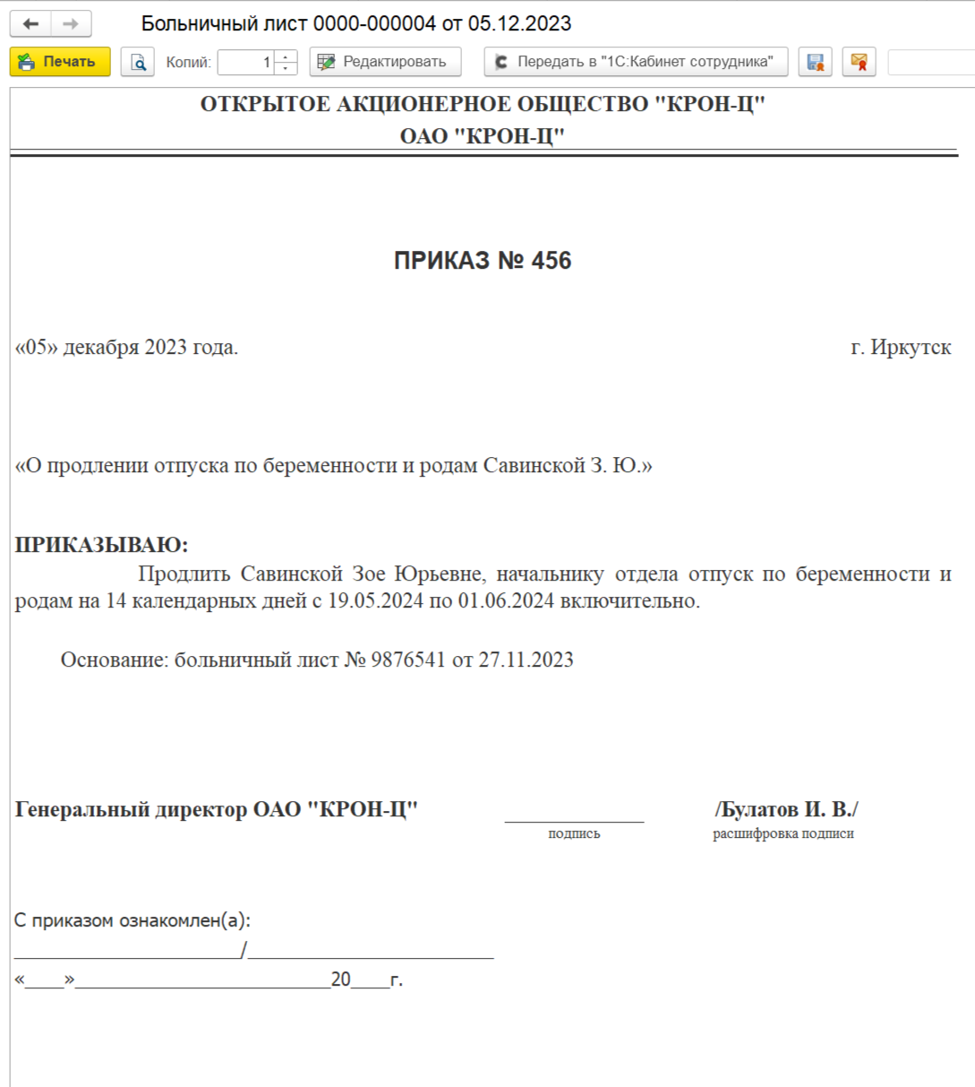 Заявление о замене части отпуска в случае, когда в документе «Отпуск» регистрируется только компенсация