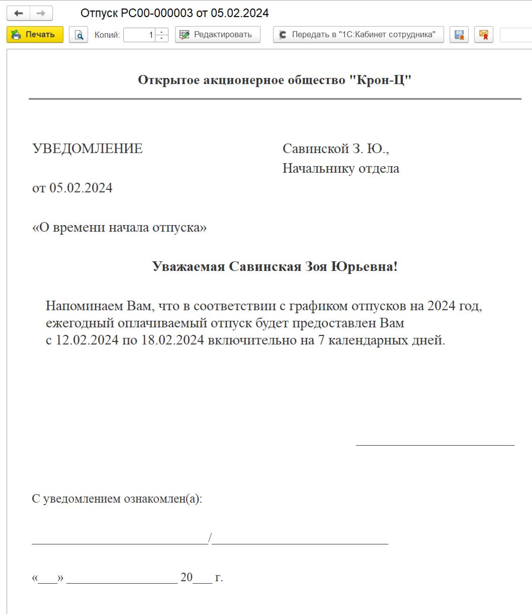 Печатная форма для представления сотруднику уведомления об отпуске за 14 дней до его начала, чтобы обеспечить исполнение ст. 123 ТК РФ